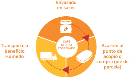 La comercialización de café en cereza se realiza principalmente en el estado de Veracruz, en el cual se estimó una superficie sembrada de café de más de 143 mil hectáreas en 2019. Gran parte de la producción que se realiza en esa entidad se comercializa en lo que se conoce como venta a pie de parcela, en otras palabras, el comprador del fruto maduro acerca su transporte o sus centros de acopio a los predios donde se está cosechando. La necesidad de procesar el fruto en un plazo de horas, obliga a los productores a la venta en el mismo día que se realiza la cosecha. El café es envasado y pesado en sacos de plástico o de lona y el comprador lo traslada al beneficio húmedo que lo procesará. Generalmente los mismos jornaleros que apoyan en el corte apoyan también en el proceso de acarreo al punto de venta.