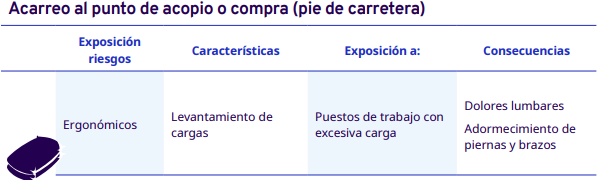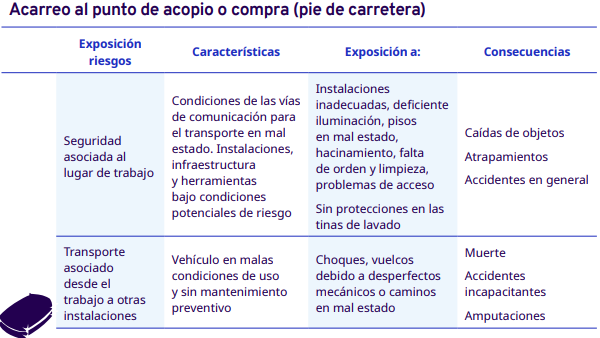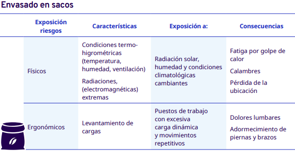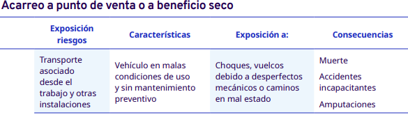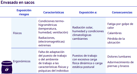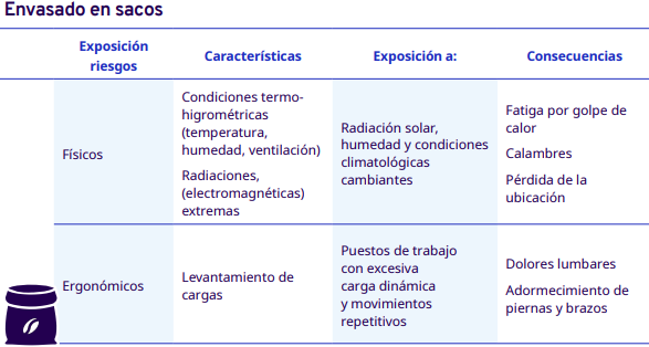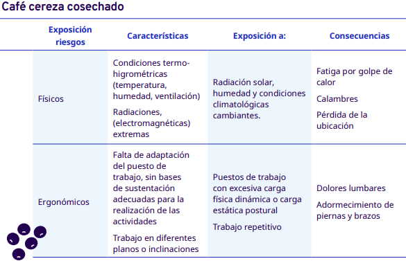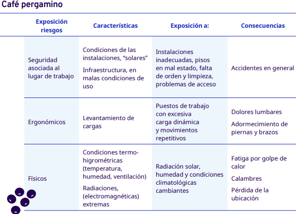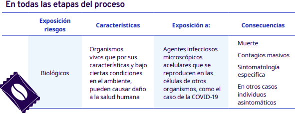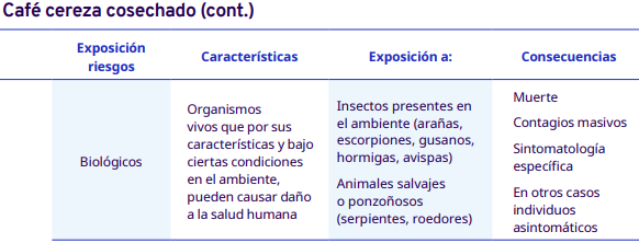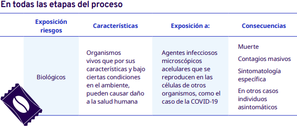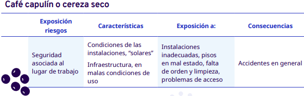 En este apartado del protocolo se presenta un análisis por cada etapa del proceso de comercialización del café: cereza cosechado, pergamino seco y capulín o cereza seco. En cada una se identificaron los factores de riesgo a los cuales se exponen los trabajadores durante sus actividades. Para la identificación y jerarquización de los riesgos, con la ayuda de diagramas de procesos, se analizaron las actividades que ejecutan los trabajadores y jornaleros, Este análisis permitió, con la aplicación de la metodología Safework OIT, ponderar aquellos factores con un grado de riesgo insoportable y grave.
