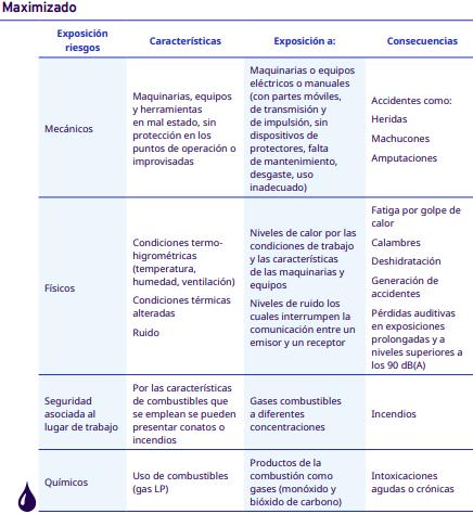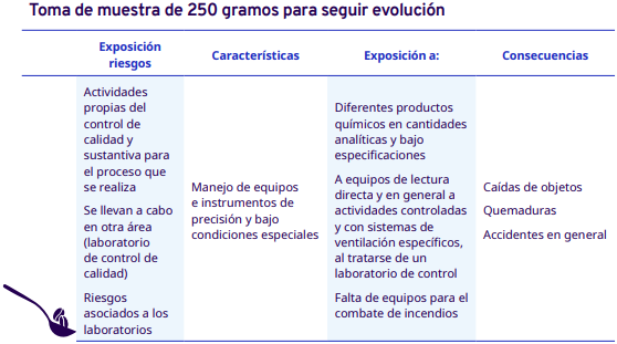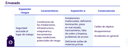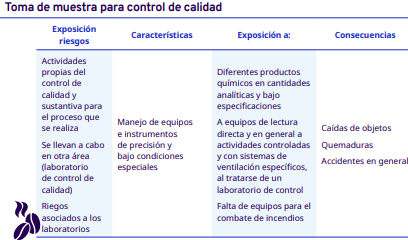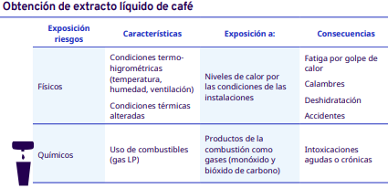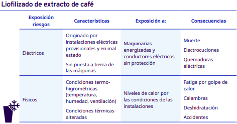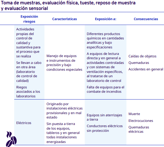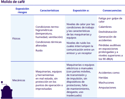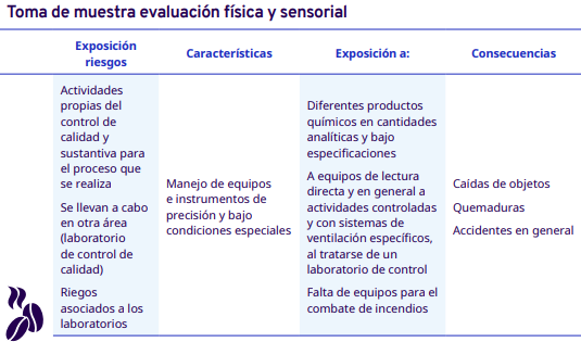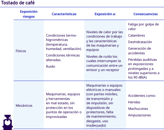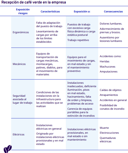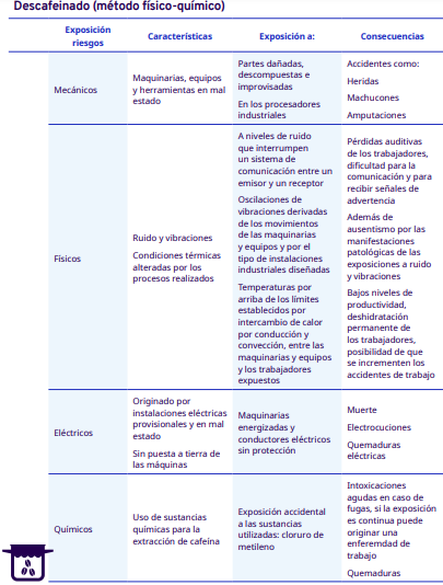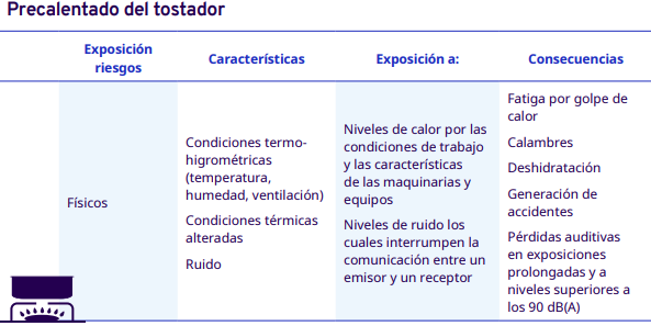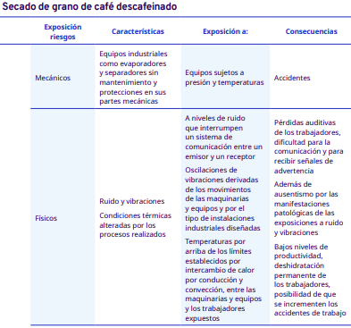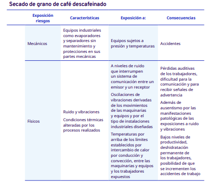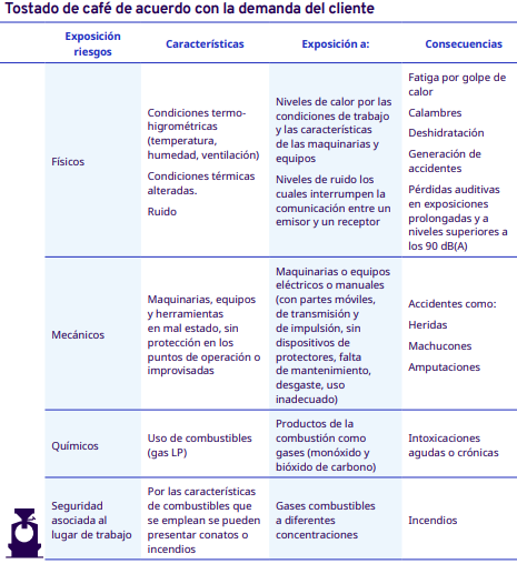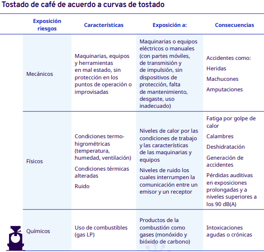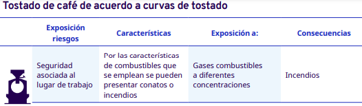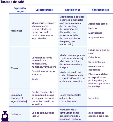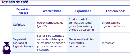 En este apartado del protocolo se presenta un análisis por cada etapa del proceso de industrialización en diferentes escalas, desde el grano entero hasta la venta del café en grano: tostadores en pequeña y mediana escala, tostadores industriales, café soluble, liofilizado y descafeinado. En cada una se identificaron los factores de riesgo a los cuales se exponen los trabajadores durante sus actividades. Para la identificación y jerarquización de los riesgos, con la ayuda de diagramas de procesos, se analizaron las actividades que ejecutan los trabajadores y jornaleros, Este análisis permitió, con la aplicación de la metodología Safework OIT, ponderar aquellos factores con un grado de riesgo insoportable y grave.