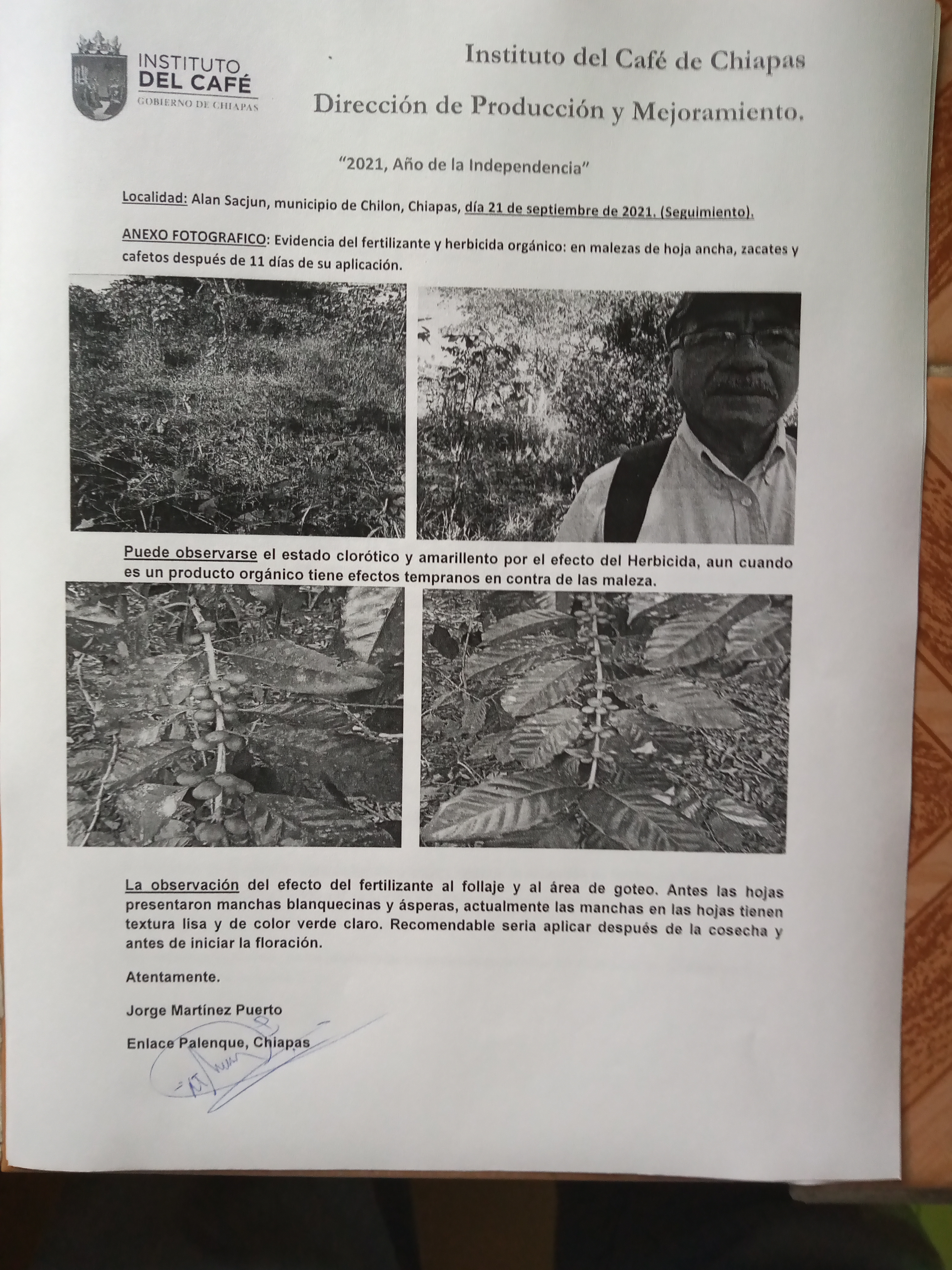 Se realizo una parcela demostrativa ubicado en la comunidad chitaltic municipio de Yajalon Chiapas se realizo prueba de un producto organico denominado SECBios obteniendose un excelentes resultado de un 95% de efectividad.