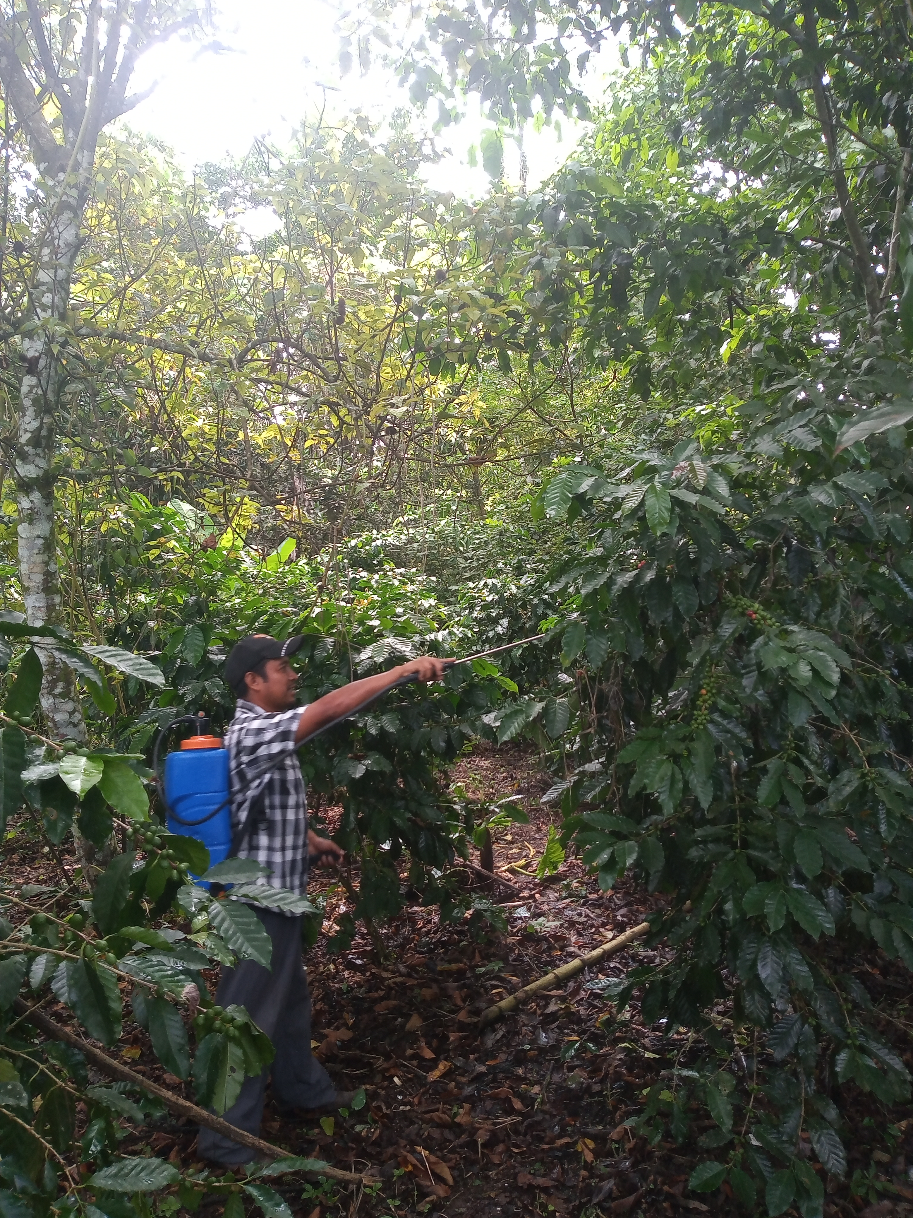 Se realizó aplicación de herbicida y fertilizante orgánicos en la parcela de café de Antonio Moreno Aguilar de Alan Sacjun, chilon